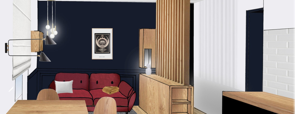 Dans ce beau 2 pièces parisien, la pièce à vivre multi-fonction (cuisine, salle à manger/salon) avait besoin d'être repensée pour mieux définir les zones de vie. Tout d'abord, repenser une entrée type vestiaire pour éviter que les vêtements et objets personnels ne finissent sur le canapé, condamnant de fait l'espace salon. Nous avons dessiné un meuble de rangement qui serve à la fois de casiers de rangement pour l'équipement du motard (bottes, casques, gants, sac à dos), et de petite bibliothèque en son extrémité. Surmonté d'un claustra en lattes de bois, l'entrée reste ouverte sur le salon en créant de l'intimité côté canapé. La zone salon a été peinte en Railings (F&B) pour un beau contraste avec un canapé couleur terre cuite. Le compteur électrique, peu esthétique à côté de la porte d'entrée, a été camouflé dans un coffrage peint dans la même couleur, le faisant disparaitre. Une suspension "grappe" apporte une jolie ambiance tandis que la lithographie signée Shepard Fairey, réencadrée se trouve mise en valeur. Une table rectagulaire et dépliable remplace la table ronde, peu fonctionnelle dans une situation de home-office.